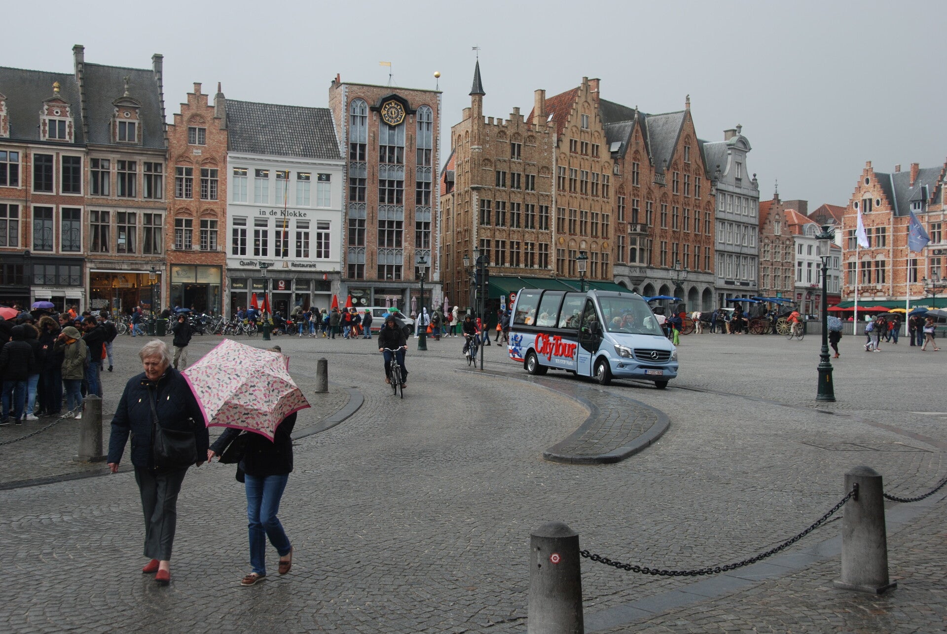 De zon is weer terug als we buiten komen en zien nu pas de prachtige entourage van de grote markt. Rijtuigen, door een paard voortgetrokken, dienen als alternatieve city-tour. Mooie historische panden waaronder het belfort, ons museum wat voorheen diende als waterhal en voorname woonhuizen omkleden de grote markt waardoor deze een zeer fraaie aanblik geeft.