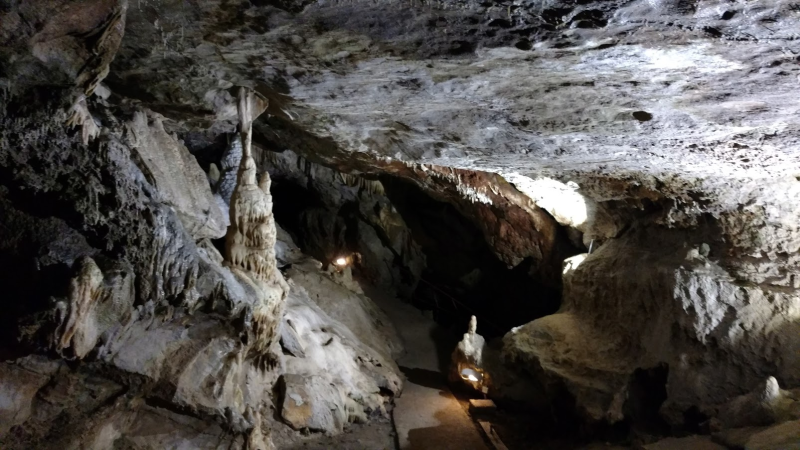Het toeristenbureau heeft de saaiheid hiervan onderkend want op de speciale plekken wordt met lampen een kleine lichtshow opgevoerd waardoor de stalactieten dan weer rood zijn en even later toch blauw. Voordat de stalactiet al druppend contact heeft gemaakt met de stalagmiet zijn we een kleine 200.000 jaar verder.