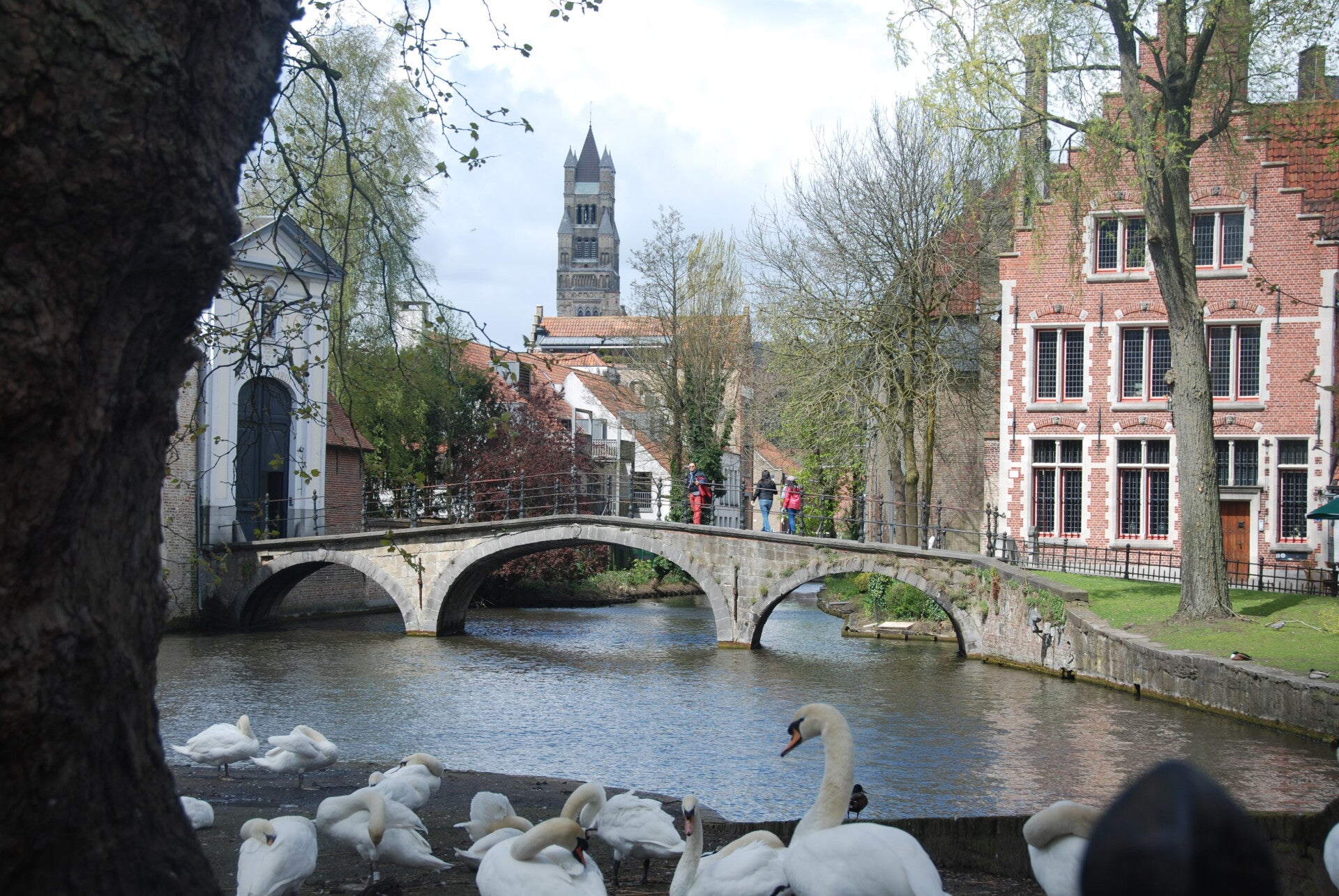 Nadat we een park zijn doorgelopen, begint het fraaie Brugge zich aan ons te tonen. Schitterende trapgevelhuisjes en kastelen aan een waterpartij bereiken ons netvlies. Grote groepen toeristen, al dan niet met een bord-hooghoudende gids, lopen ons tegemoet. Op de vele waterlopen varen afgeladen rondvaartboten.