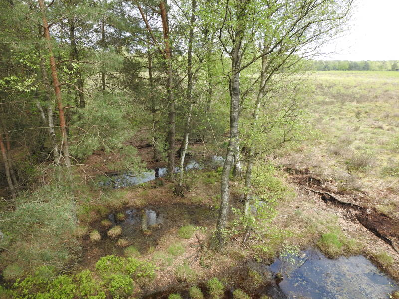 Als we verder lopen wordt het een stuk natter. De vele regen van dit voorjaar is nog lang niet weggezakt in de bodem. Het brede zandpad laat soms nauwelijks een richel over waar we langs kunnen lopen. Het bos wijkt voor een groot heideveld. Het geeft een mooi uitzicht. Er zijn nauwelijks geluiden. Soms passeert een fietser, vaak gewapend met een mountainbike. Het is natuurlijk heerlijk crossen in zo’n grote ruimte.