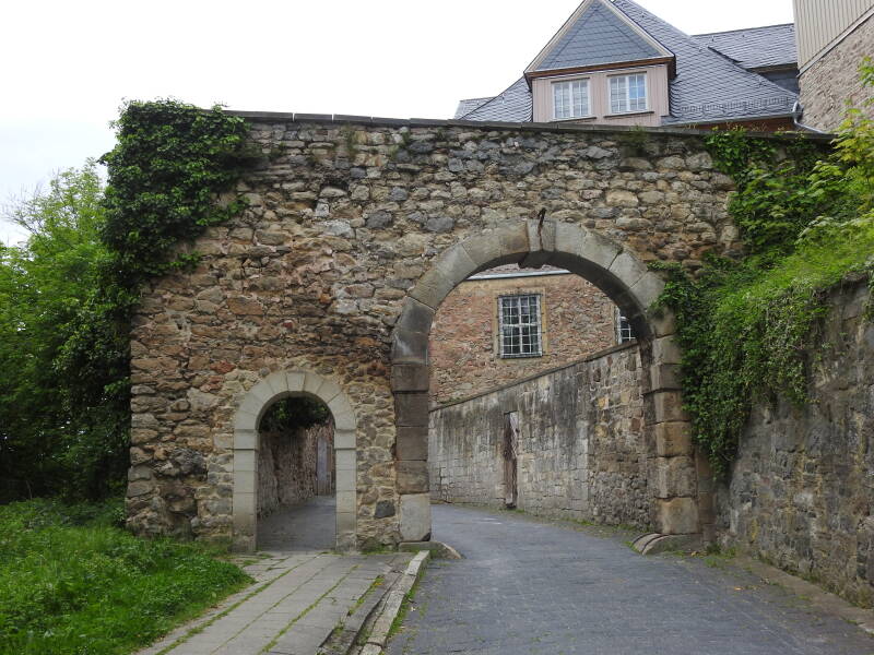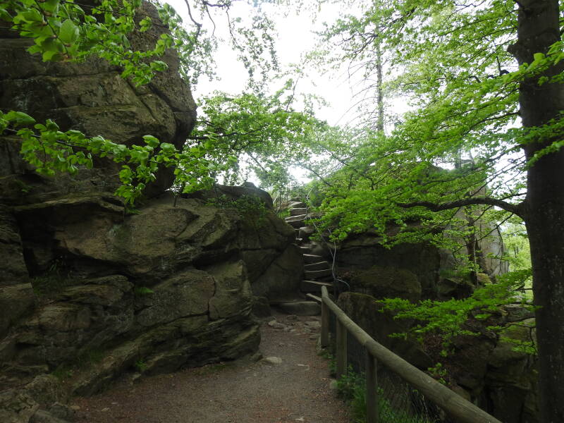 Het volgende stuk van de route gaat echt dwars door de Harz. We krijgen mooie vergezichten aangeboden, met steeds de hoogste berg van de Harz, de Brocken, op de achtergrond. De reis brengt ons nu naar Stiege. We wandelen naar een meertje. Recht er tegenover is op de bergwand het kasteel van Stiege te zien. We ploffen neer op een bankje en laten de beelden van de overzijde van fraaie huizen, het slot en ook nog een kerk heerlijk op ons inwerken. We wandelen terug naar de camper en zien dat het dorp gedeeltelijk nog in de DDR-staat is. Grote gaten ontsieren de weg en een trottoir is nog niet aangelegd. In de berm is een geitenspoor ontstaan door de wandelaars die geen risico’s willen lopen.