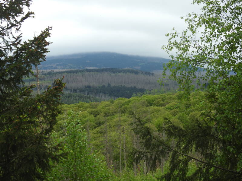 We arriveren bij de ‘klippe’. Eerst gaan we van het uitzicht genieten vanaf de, tegen vallen goed beschermde, rotspunt. We zien verschillende desolate plekken. Hele partijen bomen zijn afgestorven en staan er troosteloos bij. Gelukkig zijn er genoeg gebieden die in prachtig fris groen zijn gestoken. Op het terras van een restaurantje wil Hanna de reden van de afgestorven bomen weten. Google weet haar te vertellen dat de boomschors kever de boosdoener is. Met name de fijnsparren zijn de sjaak. Simpele zielen, zo stelt het artikel, geven de klimaatverandering de schuld. En dan wordt niet de natuurlijke bedoeld. Maar die wijten daar alle gebeurtenissen aan. Zelfs het scheefgezakte toupetje van de bovenmeester is erdoor veroorzaakt.
