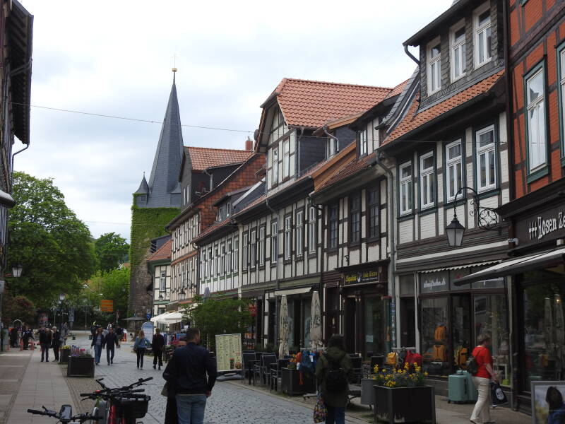 We parkeren in een rustig buurtje. Het centrum is een kwartier lopen. Daar staat de hoofdstraat vol met vakwerkhuizen. Onze kennismaking met Wernigerode is positief. Het is er druk. De middenstand heeft hier niets te klagen. We zijn onder de indruk van enkele bijzonder fraaie panden. Hanna staat een paar keer stil bij een juwelier etalage. Fraaie horloges en sierlijke halskettingen blijven trekken. Het hoogtepunt is echter een zangersduo dat midden op straat een optreden weggeeft. Beiden zijn erg goed van stem en brengen een aantal opera-nummers. Zij haalt met gemak de hoogste noten en hij stemt daar prachtig bij met een baritonstem. De vrijwillige brandweer houdt open dag, zodat tientallen kinderen in brandweer kostuum door de winkelstraat paraderen.