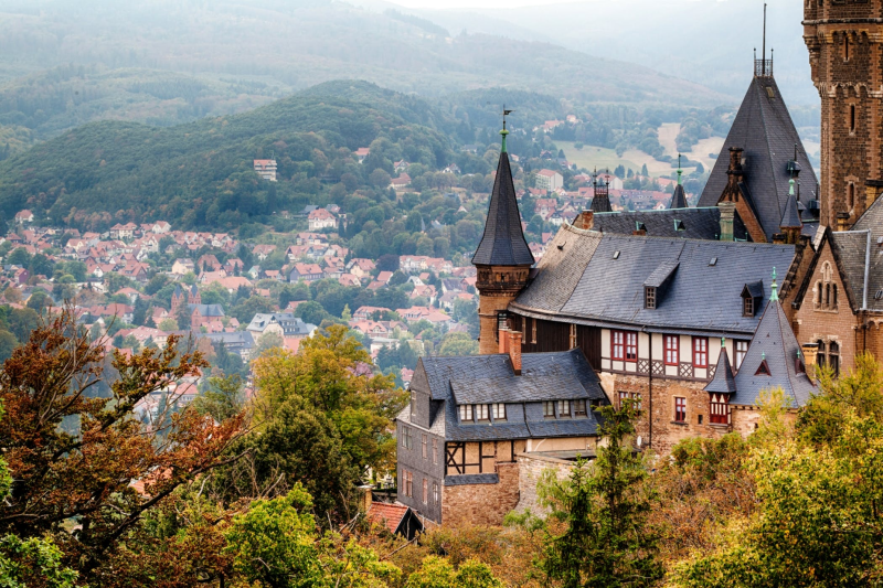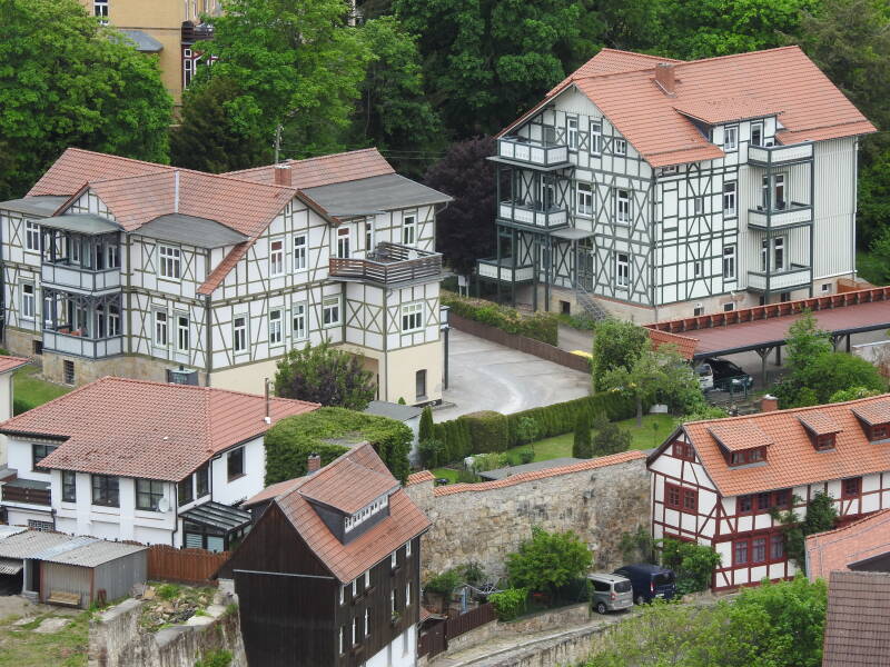 Onze nachtplaats is Blankenburg. Met een forse slotklim, komen we naast het kasteel te staan. Hier wordt overnachten gedoogd. Het slot regeert over de stad met zijn hoge positie en er ligt een wandelpark omheen. Maar wij hebben genoeg kilometers in de benen en laten het park over aan anderen. Wel loop ik naar het uitzichtpunt, vanwaar je een schitterend uitzicht hebt over dit Harz-stadje.