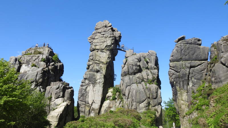 We stoppen bij de externsteine bij Horn-Bad Meinberg. Gelukkig is het toeristenseizoen nog niet losgebroken, want we mogen parkeren op een zeer groot terrein. Deze is nu (nog) vrijwel leeg. Na een korte wandeling staan we voor een rotsformatie die uit verschillende losse elementen bestaat. Door erosie is het zand in de loop van de tijd weggespoeld en staan de immense stenen poedelnaakt in het landschap. Er ligt een groot wandelpark omheen. In de zomer zal het hier heel druk zijn, maar wij hebben alle tijd en ruimte om het natuurspel te aanschouwen.