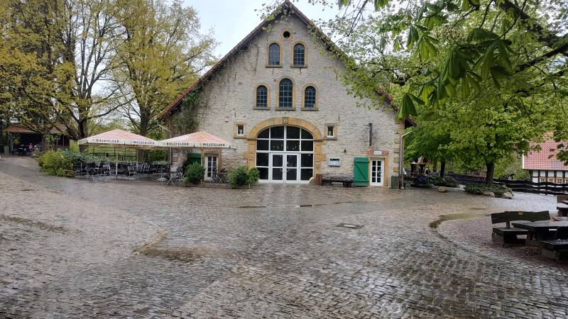 Wat het weer betreft zouden we deze dag het beste kunnen overslaan. Het wordt maximaal 5 graden, de gehele dag druilerige regen wat soms overgaat in hagel- of sneeuwbuien. Op het einde van de middag krijgen we ook nog met onweer te maken. Maar we hebben de dag niet laten rusten en toch nog geprobeerd er iets van te maken. Voor de koffie houden we een stop in Borgholzhausen. Terwijl de regen gezellig op het dak van de camper tikt, genieten we met volle teugen van het bruine goud. Het is overigens een hele mooie plek, waar we staan. Zeker iets om te onthouden. Maar we hebben het dierenpark Olderdissen in Bielefeld op het hoofdmenu staan, dus we trekken verder.
