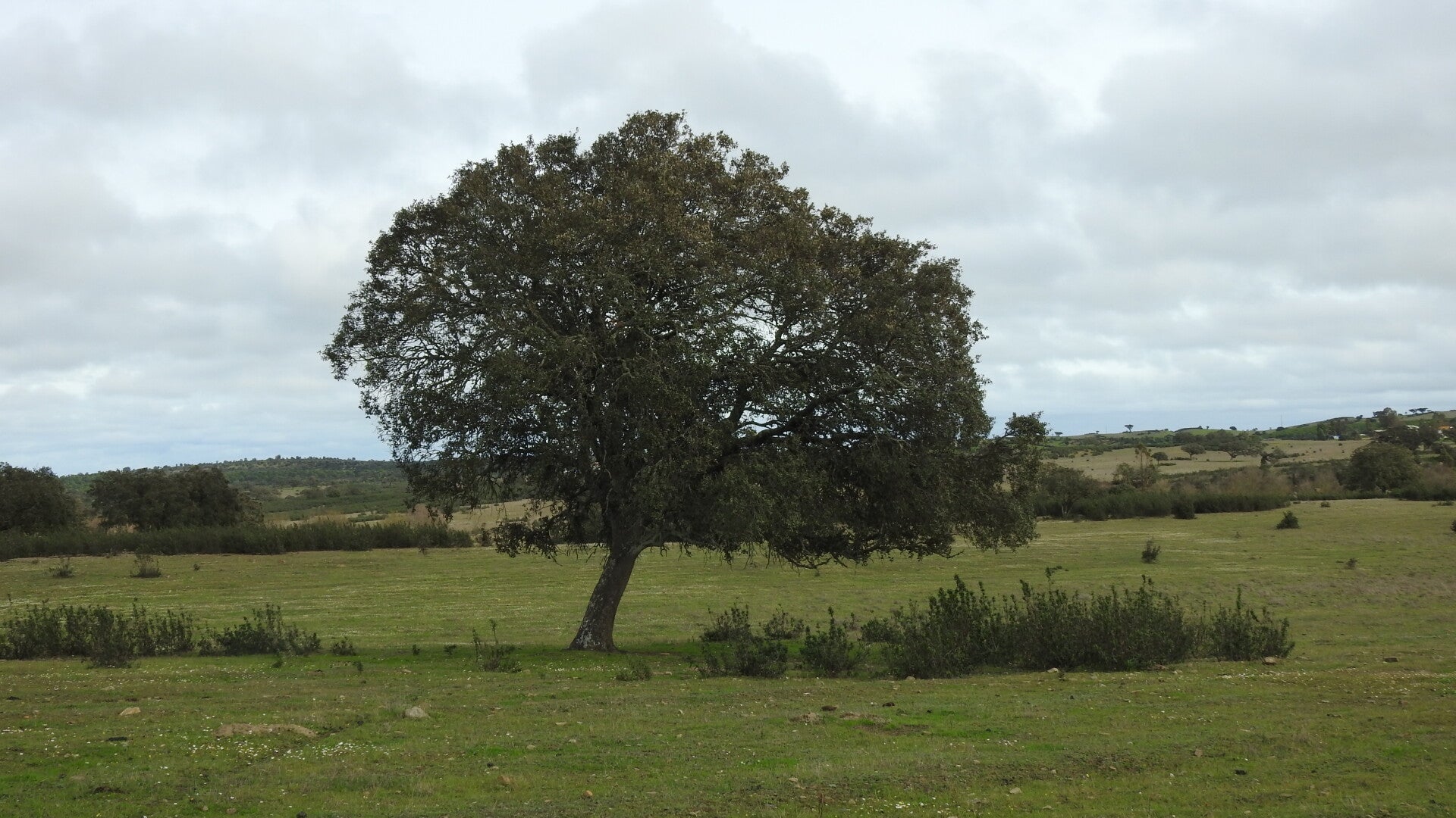 Ook de uitgezochte Lidl blijkt voor ons op een onlogische plaats te liggen, waardoor we nog uitgebreid van de architectonische schoonheid van Badajoz kunnen genieten. Na talloze rotondes vinden we dan eindelijk de weg naar Portugal. Ineens is alles een uur eerder. We rijden door een prachtig groen landschap. De velden liggen er blakend bij en runderen en schapen doen zich tegoed aan het ruim voorradige gras. Maar ook de bomen zijn groen. Deze exemplaren behouden hun blad in dit jaargetijde.