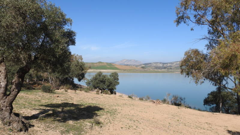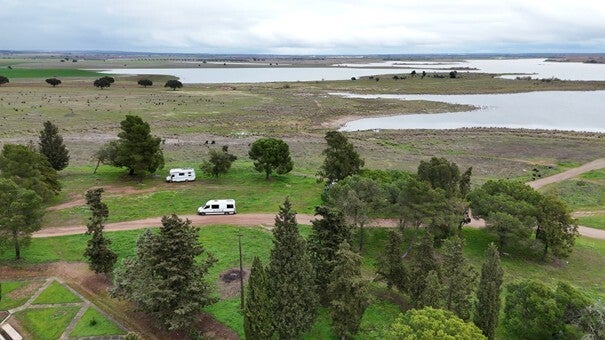 We rijden nu op de N2. Dat is voor Portugal een soort route 66. Deze gaat midden door het land van noord naar zuid. Ter hoogte van Ervidal slaan we af, richting een stuwmeer. Daar parkeren we in een soort recreatiegebied, aangelegd op de oever van dit meer. Hier en daar staan andere campers, verspreid over het hele gebied. Wat een heerlijke rust na de drie stedelijke dagen.