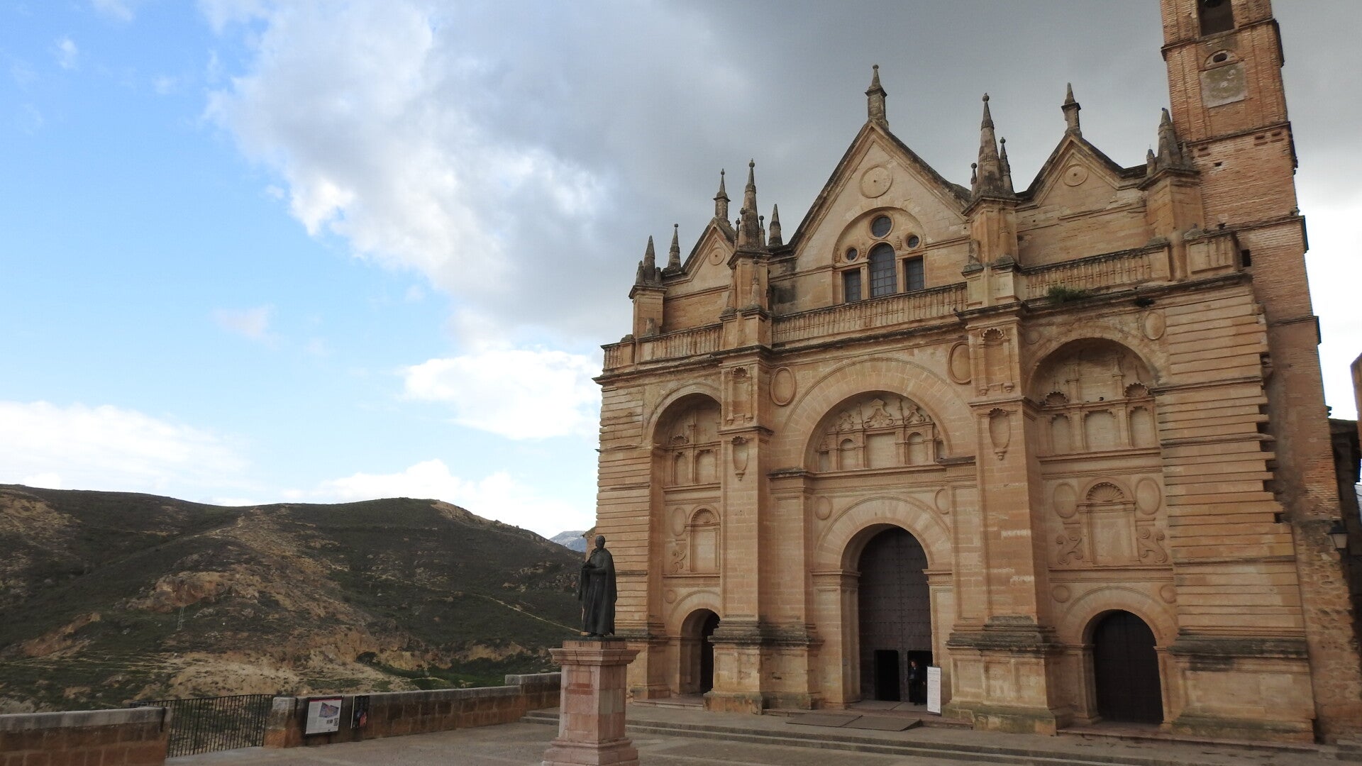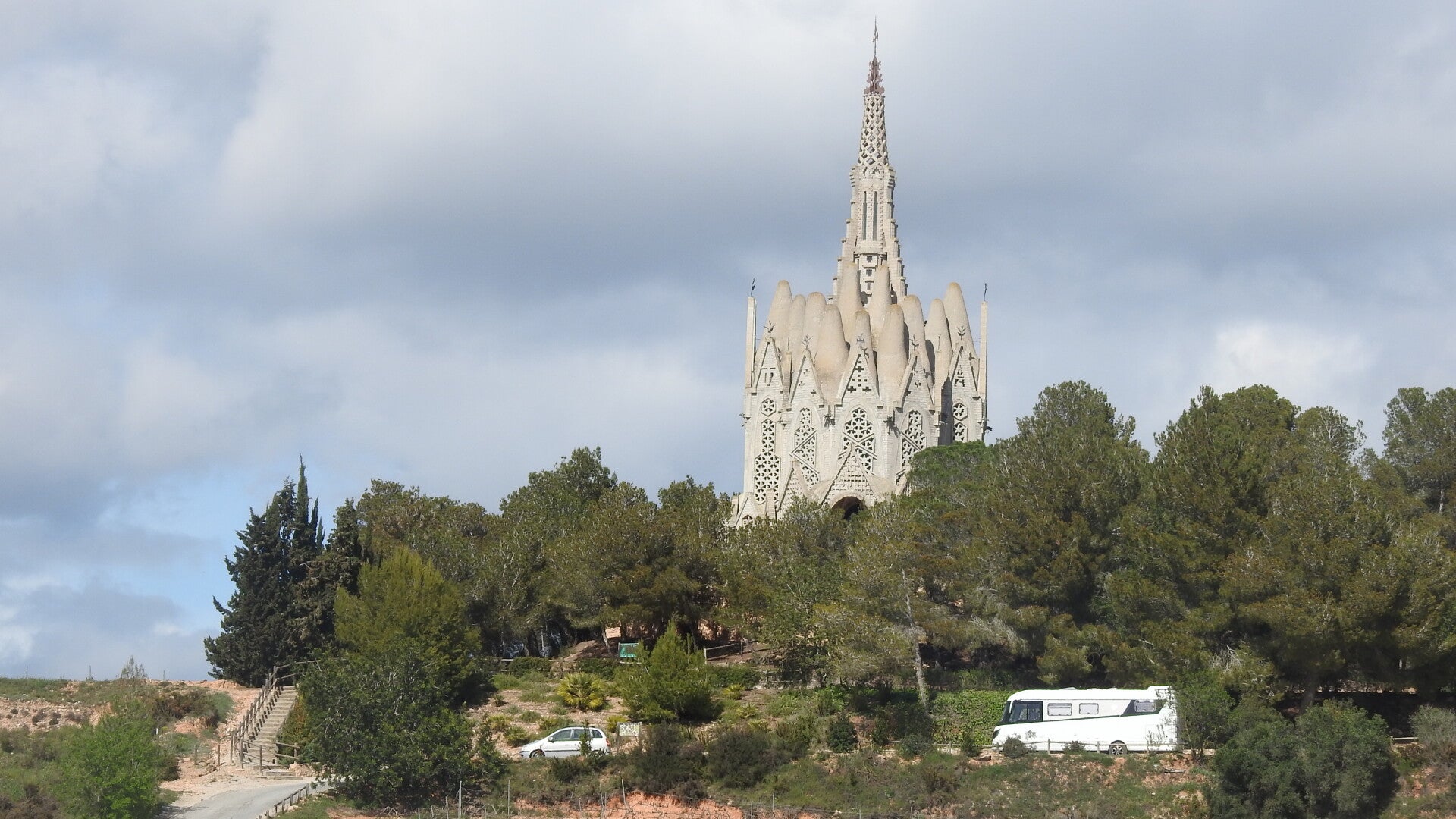We tuffen zo door naar Montferri. We rijden daar bij de heuvel omhoog en komen zo op het parkeerterrein van Santuari Montserrat. Dit is een heiligdom gebouwd voor de maagd Maria. Inwoners van Montferri gingen in het verleden altijd naar Montserrat op bedevaart, als dank voor de oogst. Een inwoner bedacht echter dat het handiger was om wat dichter bij een heiligdom te hebben. Omdat hij een connectie had met Gaudi, heeft die het gebouw ontworpen. In 1925 is het opgeleverd. Het staat op een heuvel vlak bij Montferri.