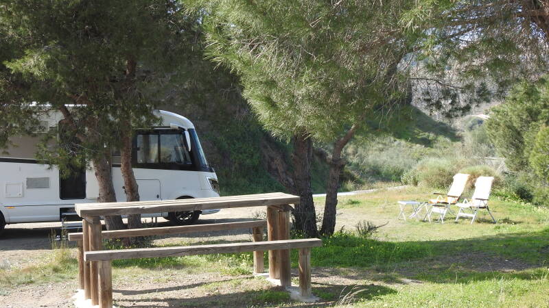 De camperplaats bij Almodovar hebben we uitgezocht als landingsgebied. Een reviewer in P4N deed zijn beklag over de langparkeerders daar. We zijn dus voorbereid. Direct bij aankomst overzien we het slagveld. Alle plekken zijn bezet, de isolatiematten hangen nog half voor de ramen. Tuinsetten, motoren en fietsen staan vastgeklonken aan het hek. Deze camperaars zijn niet van plan nog te vertrekken, hoewel het gemeentelijk bord meldt dat het maximale verblijf 72 uur mag duren. Gratis stroom en alle voorzieningen geeft hen definitief een thuis gevoel. Feitelijk kan de camper worden ingewisseld voor een tuinhuis.