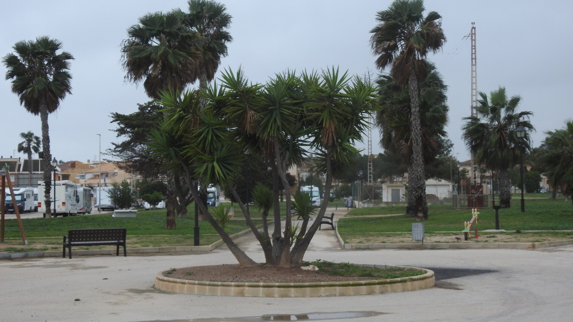 Ook zijn er nieuwbouwprojecten waarvan voorlopig alleen de infrastructuur er ligt. Ook dit is prijs voor camperbezitters. De nieuwe, huisloze wegen staan volgeparkeerd met winterzonzoekers. Tegen de avond komt een politiepatrouille even op het terrein kijken maar vinden alles best zoals het er staat.