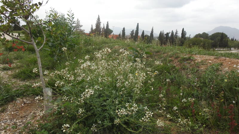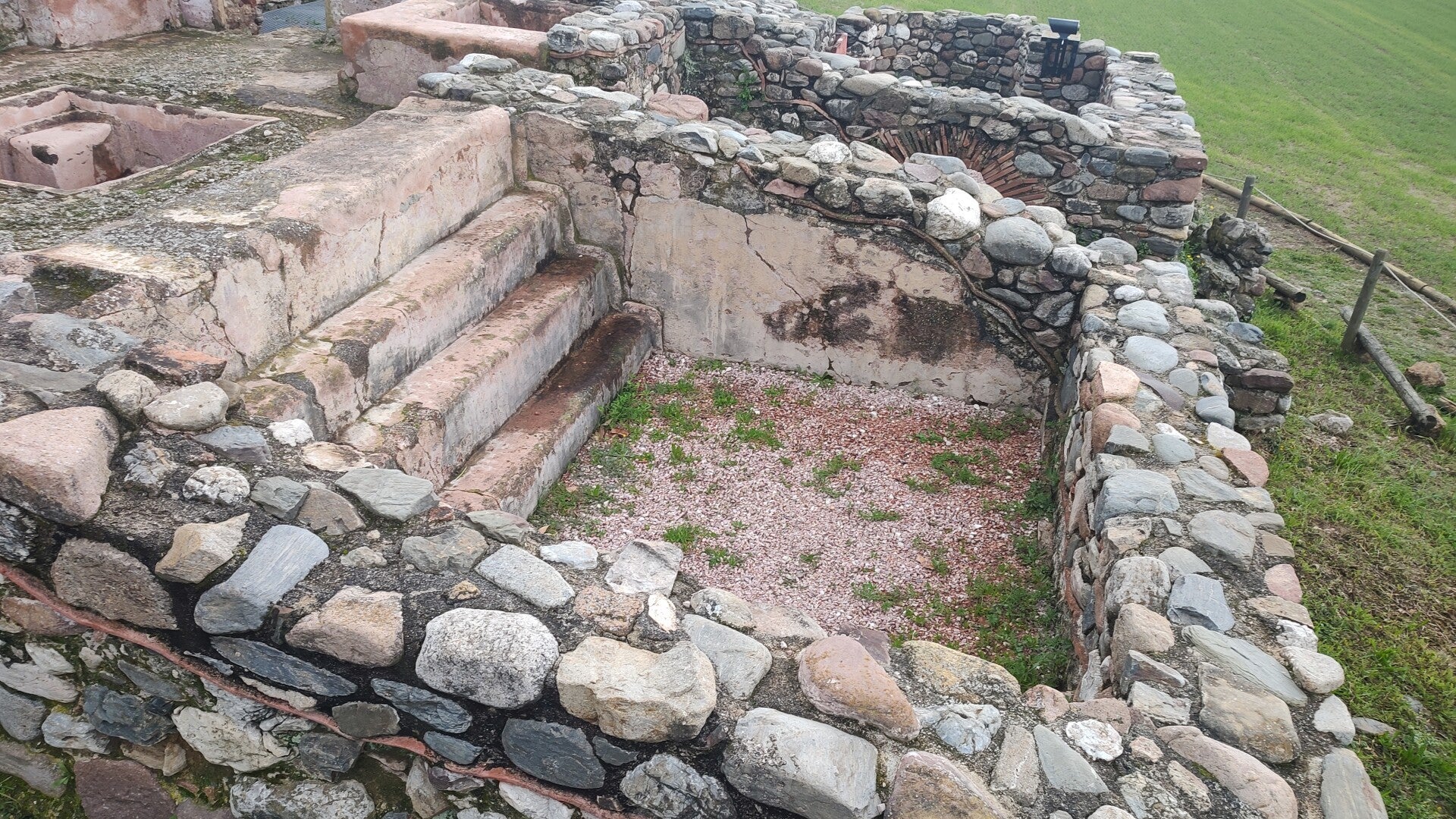 We wachten de laatste regendruppel af en dan stappen we naar buiten. Vlakbij, nog geen tweehonderd meter, is een Romeinse opgraving. Het zijn de restanten van een Romeinse villa waar een zeer belangrijke meneer in moet hebben gewoond. Slechts een deel van de vaak overdreven grote oppervlakte is blootgelegd. De nodige borden vertellen over het leven van toen. Er staan kijkers opgesteld. Als je daar met een oog een blik in werpt, zie je een getekende situatie van hoe dat deel van het pand er uitgezien zou kunnen hebben.