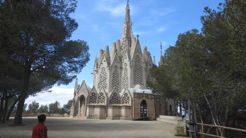 Hanna en ik bekijken het gebouw van alle zijden. Het is een typisch Gaudi product. In veel lijkt het op de Sagrada Familia in Barcelona, alleen is het stukken kleiner. Rondom het bouwsel is nog een klokkentoren en een geheimzinnige grot gerealiseerd. De deur zit op slot en die gaat pas op woensdag er weer af. Voor ons blijft het dus een buitenzijde.