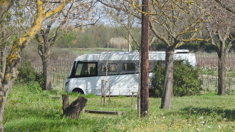 Het is op de Franse wegen drukker dan op die van hun zuiderburen. Voor rotondes ontstaan zo nu en dan mini-files. Net na twaalven arriveren we in Montblanc, een dorp ten westen van Béziers. De laatste meters gaan over een zeer smal paadje, maar we vinden een prachtige stopplaats. Gelegen tussen een parkje en een groot veld met druivenstruiken, lekker uit de wind en in de zon. Lekker half liggend in de stoelen laten we de warmte over ons heen komen.