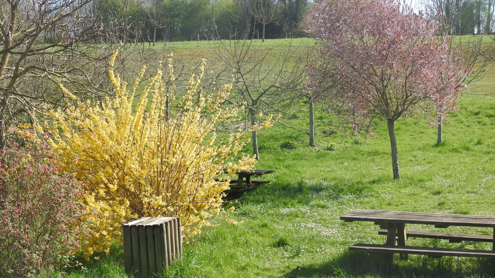 We slenteren in de middag door de omgeving. De vrije camperplaats ligt in een klein parkje. Hierin zijn diverse sporttoestellen gezet, om de bevolking wat aan het bewegen te krijgen, denken wij. Prachtig bloeiende bomen, zoals de forsythia, kleuren het terrein vrolijk op. Hier en daar staan picknickbanken. Ook in deze streek is het heel gewoon om ‘s avonds of in het weekend met de hele familie het park in te trekken en daar een hele tijd zich te vermaken met het eten van allerlei lekkere dingen.