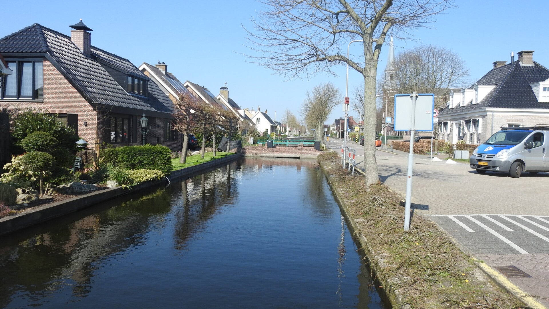 We lopen de plaats in. Er loopt een smal water, recht als een lineaal, van noord naar zuid en die is aan weerszijden bebouwd. Dit is de hoofdstraat waar veel winkels en andere consumentgerichte ondernemingen staan. Mooie Hollandse huizen met luiken en een fraaie gevel zorgen voor een gezellige sfeer. Terug bij de camper zetten we de stoelen buiten en kunnen we nog een hele tijd heerlijk in de zon zitten.