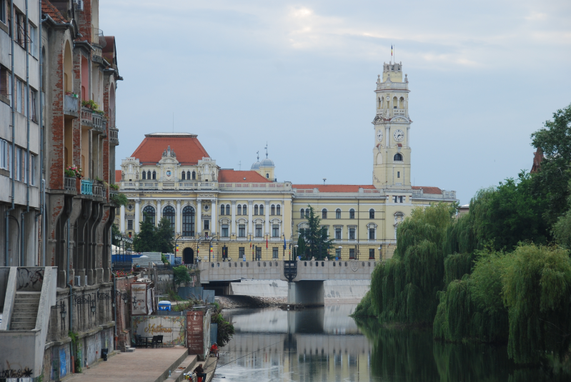 In het centrum van Oradea weten we een parkeermogelijkheid en zo staan we voor een keer midden in de drukte. Wel prachtig langs een rivier met ooit statige gebouwen als achtergrond. Ze missen enig onderhoud.