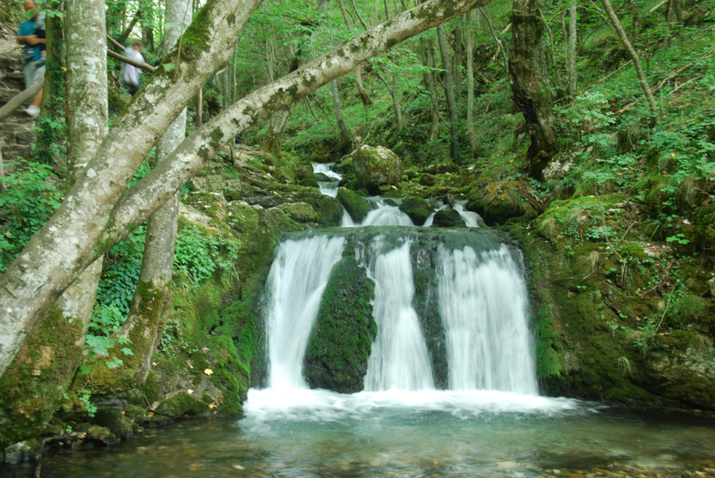 Langs ons looppad ruist een rivier met ons mee. We zijn nu bijna bij de waterval ‘Bigar Falls’. Als half Roemenië er voor uitloopt dan moet het wel een en al spektakel zijn. Aan de overkant sijpelt water naar beneden langs een met groene mos bedekte rots. Het publiek staat stil en maakt foto’s, Vanaf de weg of vanaf de speciaal gebouwde balustrade die wat lager hangt.