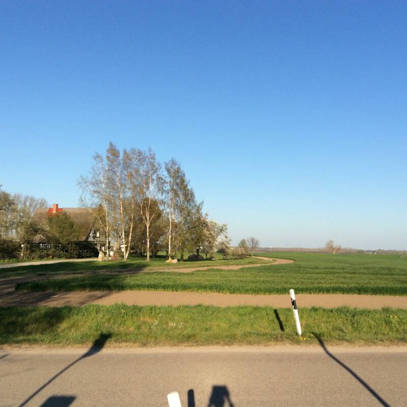 Het park is het grootste in Duitsland. Naast de arenden komt ook de kraanvogel graag in dit gebied. Op de gronden worden runderen en schapen uitgezet om te grazen. Na krap een uur trappen komen we in Speck aan. Een gehucht met een paar huizen. Een boerderij met een eigen poort is het grootste bouwwerk, hoewel er wonderwel ook een leegstaand flatgebouw staat. Waarvoor het dient is onduidelijk, zal wel een erfenis uit de DDR-tijd zijn. We bezoeken een schattig klein kerkje wat ietwat afgezonderd staat van de huizen.