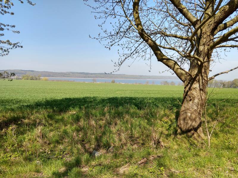 Na Middenhagen rijden we een eind de landtong op. Al gauw verschijnt de Baltische zee naast ons. Verweg van de laatste dorpskern weten we een parkeerplaats nabij een whiskeystokerij. Het is lastig om een beetje horizontaal te komen staan maar we hebben een geweldig uitzicht over het water. Aan de overzijde rijst een hoge heuvelrug op uit het water. Bloeiende bomen versieren onze kant. We besluiten hier de nacht door te brengen.