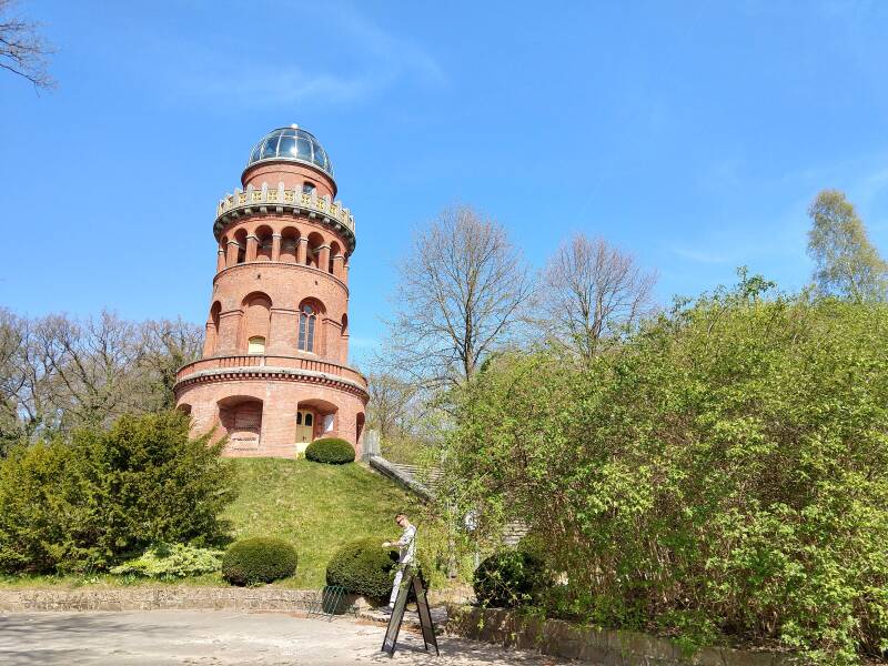 Het moet gezegd: de toren mag er als bouwwerk best wezen. Fraai opgetrokken met rode baksteen, onderbroken door een aantal omgangen. Bovenop is een glazen koepel geplaatst. We willen uitkijken vanaf de toren.