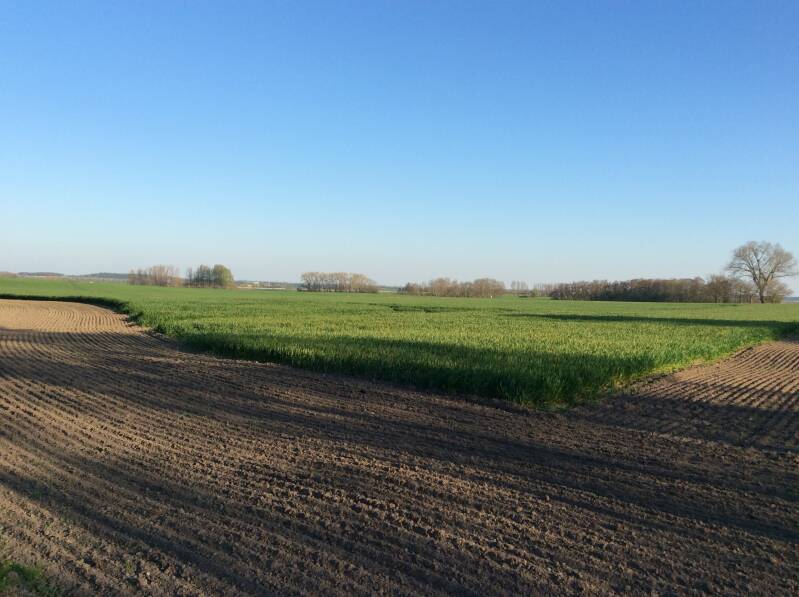 Ik stap op de fiets. Rond Bergen liggen uitdagende fietspaden volgens de folder. De asfaltweg wordt al heel snel een bescheiden strook. Vlot daarop verandert de ondergrond in een zandpad. Het rolt vanzelf. Dat is geen goed teken voor de terugweg. Het eerste doel is Buschvitz. Na een eerste aanduiding verdwijnt het daarna uit de routeborden. Rechtdoor zolang het parcours het toelaat, is mijn uitgangspunt omdat ik kennis heb genomen van de kaart. Het bospad stopt en ik sta in een weiland.