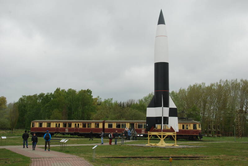 We staan op historische grond met een dubieus verleden. Een grote zwart-wit geschilderde raket staat rechtop de ruimte in te wijzen. Daarachter zien we een treinstel uit de jaren ‘40 vorige eeuw. Ernaast ligt een groengeschilderde lanceerbaan. Een gevleugelde raket met straalmotor lijkt klaar te liggen om te worden afgevuurd. Verderop is een groot gebouw waarop de letters ‘ ausstellung’ staan.