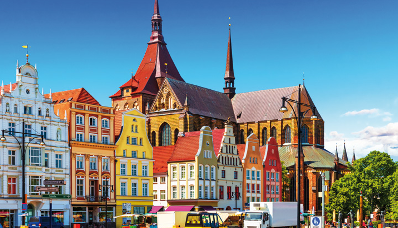 In Wismar lopen we via het park naar de ‘Altstadt’. Met behulp van toeristische wegwijzers vinden we het marktplein. Het volledig met kinderhoofdjes belegde plein is omzoomd met prachtige gebouwen. Mooie panden in warme kleuren dragen met trots een trapgevel. Een verfraaid gebouw, volledig in het wit, beslaat in z’n eentje de westflank. Antieke schoolbussen vervoeren nieuwsgierige toeristen voor een stadsrondrit.