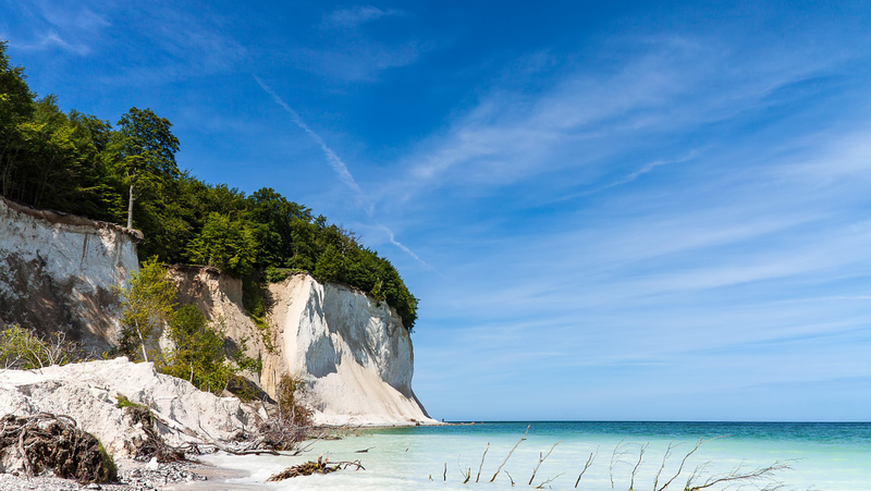 De pijl wijst naar rechts. Gedwee volgen wij de opgegeven richting en komen bij een houten vlonder. Door het frisse bosgroen zien we al een witte wand. Ik kijk naar de andere zijde en ook daar glimt een wit vlak. Na een paar stappen staan we op een plateau. Door het een met het ander te combineren is de conclusie dat we bovenop de ‘Koningsstuhl’ staan. Op deze manier zien we er weinig van. Het uitzicht op de Baltische zee is bijzonder fraai. Kleine zeilboten proberen een enorme veerboot van Stenaulijn dwars te zitten en op de horizon zien we de kust van Polen.