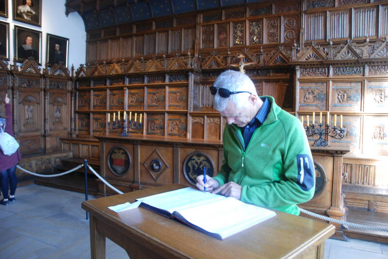 We staan in de Friedensaal van het Rathaus in Munster. Deze originele zaal uit het jaar 1648 ademt nog de sfeer van toen. Prachtig houtsnijwerk versiert de houten wanden waarin ook vele kasten en andere opbergruimten zijn verwerkt.