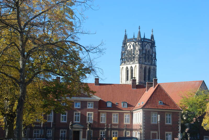 We zwerven door de straten van deze Duitse stad. Als we de Sint Lambertuskerk willen betreden, is er een heilige mis gaande. Bij de tweede poging zien we een sobere kerk van binnen wat afsteekt bij de uitbundige laat-gothische bouw van het exterieur. Opvallend is het hangende orgel. Dit enorm zwaar ogende muziekinstrument hangt aan slechts twee balken.
