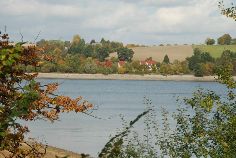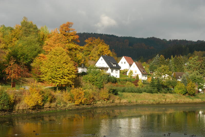 We wandelen verder. Zo passeren we het lieflijke dorpje Helminghausen. Met de komst van het grote stuwmeer is het leven hier 180 graden gedraaid. Een grote camping en veel horecazaken danken hun bestaan aan het toerisme wat door het grote meer wordt aangetrokken. Een mooi kerkje staat aan de waterkant en toont zijn silhouet tussen de eenden. Een gedenkplaat vertelt het verhaal van de molenaar. Hij heeft zijn molen verkocht aan de maatschappij die de waterkering ging bouwen. Het daardoor vervallen geraakte bouwwerk is in 1973 gesloopt.