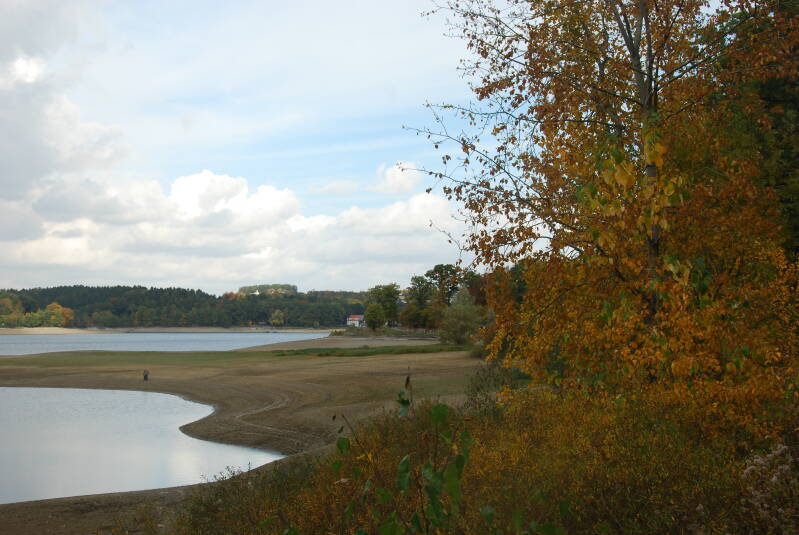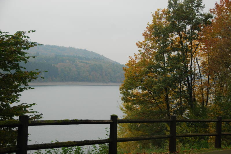 We pakken ons rijwiel en gaan richting Biggesee. De fiets krijgt het zwaar als het pad steil oploopt met echte haarspeldbochten. Maar de koers is juist zodat we daarna aan de oever van het stuwmeer staan. We volgen de schitterende fietsroute langs de oever. Iedere kromming in de waterlijn wordt blindelings gevolgd door het pad. Het bosgebied wat we doorkruisen heeft alle bomen al voorzien van een herfsttooi. Gele, rode, oranje en lichtbruine bladeren geven de omgeving een gepaste sfeer.