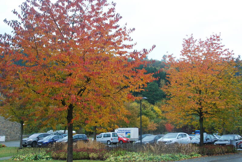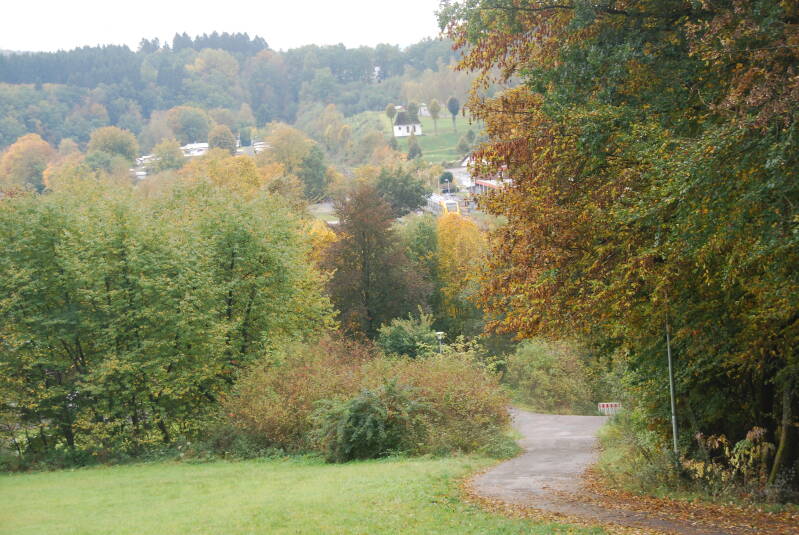 De weg na Altena wordt al snel smaller. Uiteindelijk slechts een ruime camper breed. Echte haarspeldbochten en steil omhoog. Maar wel prachtig door de herfstbossen aangelegd met mooie vergezichten als bonus. Voor tegenliggers is er feitelijk geen plaats en als deze zich dan toch vertoont, rest hem niets anders dan achterwaarts rijden totdat er zich een natuurlijke verbreding aandient.