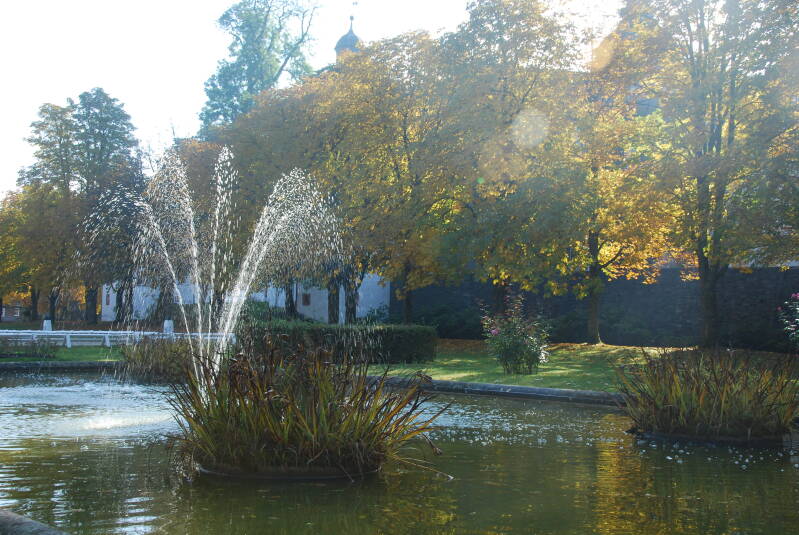 Grote vijvers met eenden, zwarte zwanen en een exotische ganzensoort blinken in het zonlicht. Het levert prachtige beelden op. We kijken over de vijver langs de gele en oranje kleuren met hier en daar nog echt bladergroen naar het hoog gelegen barokke paleis. Eenden snateren de stilte weg. Meerdere wandelaars zijn getuige van deze wondermooie compositie op deze zondagmorgen.