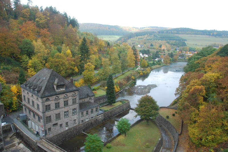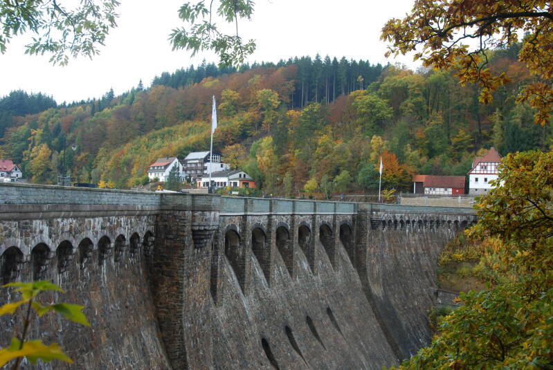 Deze situatie bestaat al 100 jaar. Het Pruisische gezag heeft begin 1900 opdracht gegeven voor de bouw van deze waterkrachtcentrale. Het grote spaarbekken wordt doorlopend aangevuld door de rivieren de Diemel en de Itter. Via een schacht in de muur worden door de waterstroom de generatoren aangedreven.
