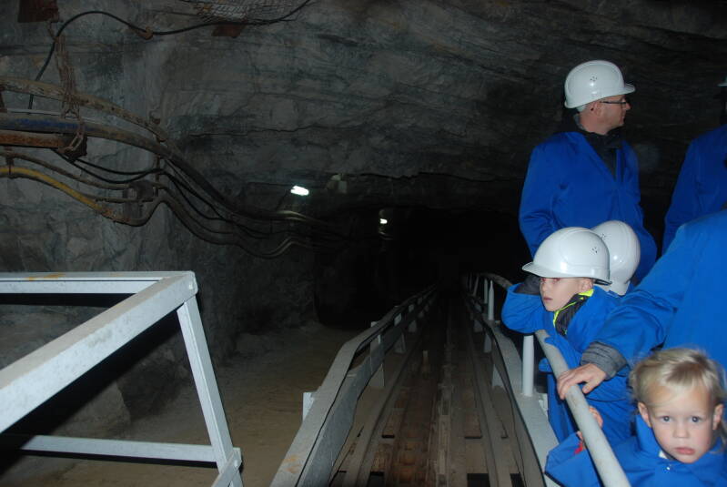 Met de overige passagiers staan wij, gekleed in een blauwe kiel met op het hoofd een witte helm, in een ruimte van een vroegere ertsmijn. De rondleiding kan beginnen. Een enthousiaste, alleen maar Duits sprekende, gids begint te vertellen over de vele gangen, schachten en verdiepingen in de mijn van Ramsbeck. Hij verwoordt hoe vroegere kompels het erts loswerkten, in lorries laadden en naar de uitgang transporteerden. Alles is nog in tact. Er is zelfs hoop op betere tijden omdat er nog vele miljoenen tonnen erts in de grond zitten. Het enige rendement van de mijn nu is het toerisme.