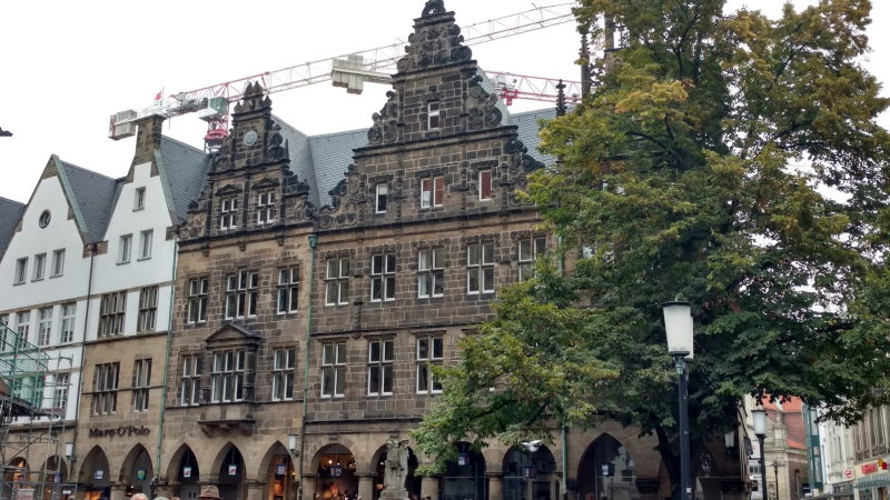 Onder een dreigende lucht lopen we naar het centrum. De straten zijn typisch Duits met witgekalkte vakwerkhuizen. De opzet van het stratenplan is heel bijzonder. Er zijn meerdere pleinen waar rondom belangrijke en minder belangrijke gebouwen staan. Zo staat er een mooi (?) roze Rathaus tegenover een rood geschilderde galerij met meerdere poorten. Een plein verder komen we twee er tegenaan gebouwde godshuizen tegen.