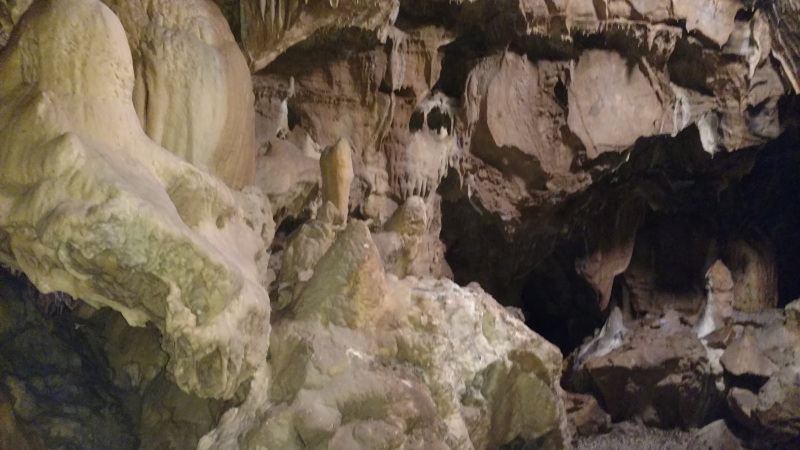 We dalen met een vrij grote groep af. De rondleider legt uit dat niets mag behalve doorlopen en kijken. We volgen hem. Al gauw staan we in de wonderlijke wereld van het onderaardse. Het is verbazend dat de aarde van binnen zulke holten bevat die je dan bij toeval ontdekt. De druipsteengrot laat zich goed bekijken.