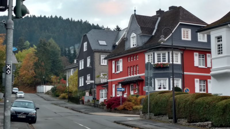 We gaan de stedenbouwkundige stijl van het Pruisisch Classicisme bewonderen in Schmallenberg. Na een stadsbrand is de gehele binnenstad destijds vernieuwd naar dit model. Na aankomst zien we inderdaad twee parallelle hoofdstraten met meerdere verbindingswegen in de vorm van een ladder. De aangebouwde panden vertonen een zekere gelijkmatigheid in vorm en bouwmateriaal. Maar eerlijk gezegd was dit het omrijden niet waard. De straten onderscheiden zich niet echt in die mate dat er sprake is van een bijzonderheid.