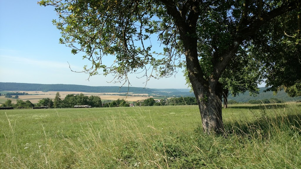 We halen Aura an der Saale, zij het om 22.30 uur ’s avonds. Het is feest op de camperplaats. Het staat bomvol auto’s en er klinkt luide muziek uit het horecapand. Wel staan we prachtig, hoog op een heuvel pal voor een kasteelruïne.