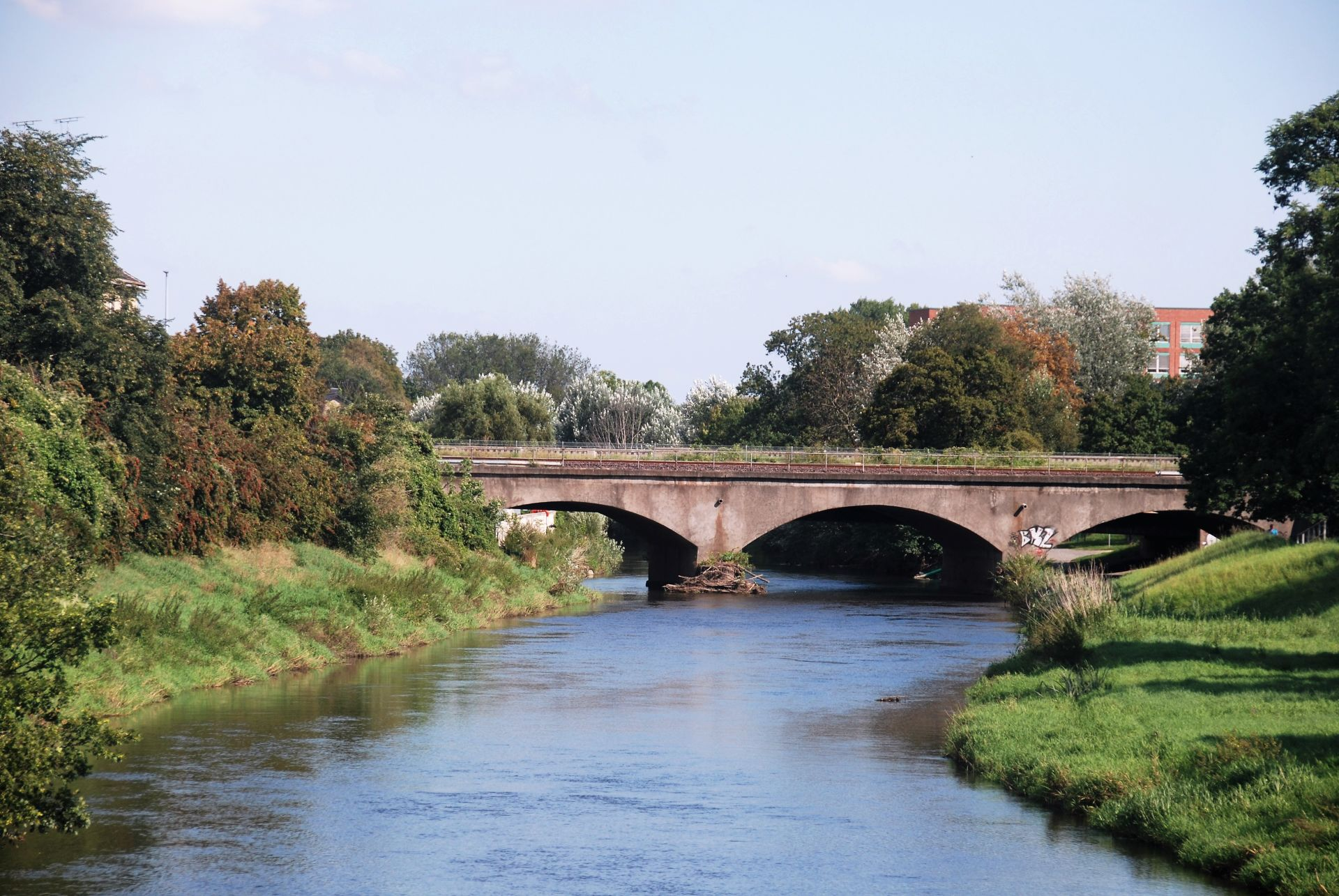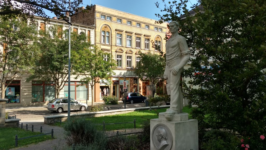 Nadat we de camper een plekje hebben gegeven, trekken we de wandelschoenen aan. We lopen strak op de kerktorens aan in de veronderstelling dat daar het centrum is. Niet in Stassfurt. Dan moet je de andere kant oplopen. Via een verkeersbord komen we achter deze wijsheid. Wel mogen we dankzij deze vergissing tweemaal de rivier ‘Bode’ oversteken. Gelukkig kan dit over de brug.