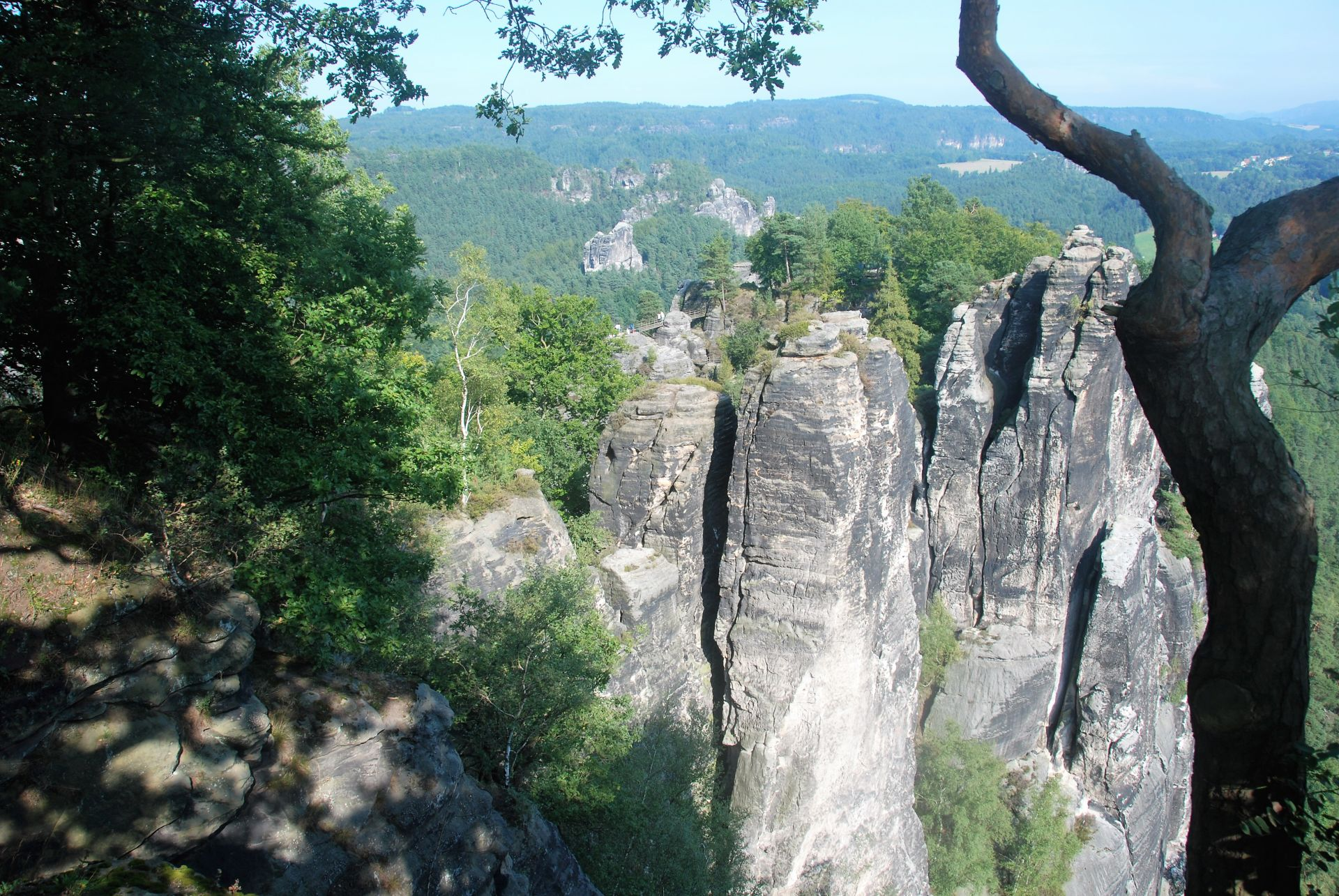 Ik overtuig Hanna voor deze uitdaging en we gaan op de fiets richting kloof. Al gauw blijkt dat we bij lange na niet de enigen zijn. De kloof en zijn omgeving wordt Saksisch Zwitserland genoemd en de nieuwsgierigen worden per bus vol aangevoerd naast vele personenwagens.
