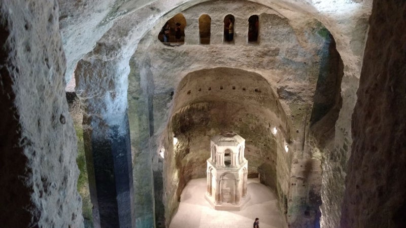 Nadat we 5 euro per persoon hebben betaald mogen we verder. Voorzichtig stappen we de grotkerk binnen. We hebben een audiotelefoon in bruikleen die in het Engels uitlegt waar we naar kijken. We staan in Europa’s grootste kathedraal onder de grond. Het gewelf is 20 meter hoog. Onvoorstelbaar dat noeste voorouders hier in de 12e eeuw een complete kerk hebben uitgehouwen in de rotsen. We hebben er alle begrip voor dat de vloer niet egaal is en dat de wanden niet strak recht zijn. De telefoon legt uit dat het ondergrondse gebouw vroeger nog veel groter was maar dat erosie een fikse hap uit de historie heeft genomen.