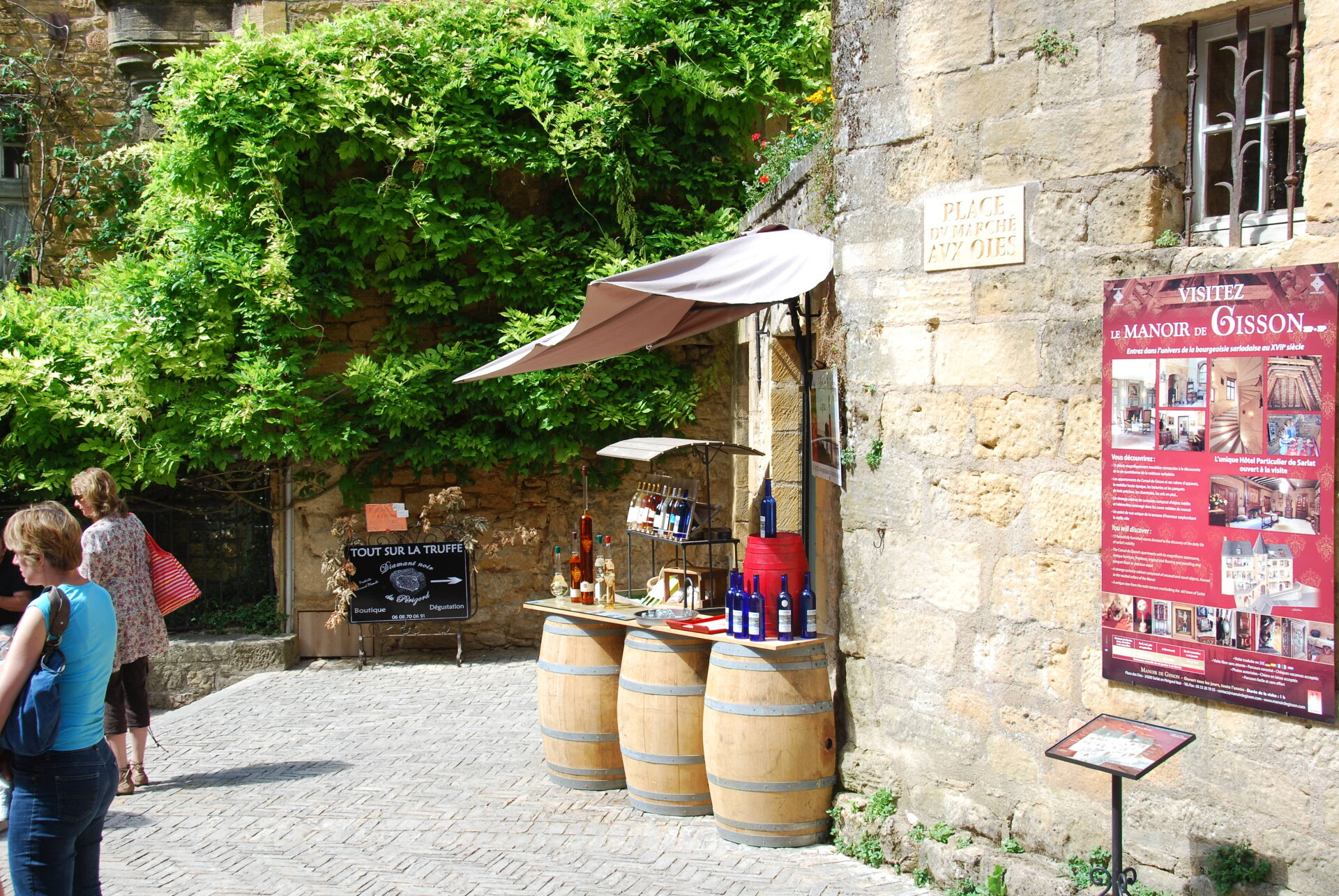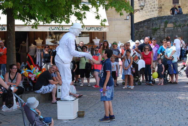 Een klein eindje verderop vinden we de grotwoningen van Les Eizies. We wandelen door deze plaats en komen op een overdekte markt met streekproducten terecht. We rijden door naar de grotten van Le Lascaux. Deze zijn wereldberoemd om de rotstekeningen en het is er dan ook behoorlijk druk. We sluiten ons aan bij de lange rij. Maar we zien niemand kaartjes kopen. We informeren hoe dat zit en we krijgen te horen dat je toegangskaarten kan kopen in het dorp. Daar zien we maar vanaf gelet op de grote drukte. We zoeken de CP van Sarlat op en vinden daar het laatste plekje. We gaan Sarlat ontdekken en het blijkt een prachtig middeleeuws stadshart te hebben. Het is er erg gezellig, er zijn veel toeristen en diverse straatartiesten tonen hun kunsten. Als het donker is, gaan we nog een keer naar het centrum. Wat een heerlijke sfeer treffen we eraan. Diverse muzikanten spelen, ieder op hun eigen wijze, op verschillende straathoeken. Restaurants hebben terrassen die de hele straat bezetten. Er gebeurt van alles en we vermaken ons prima.