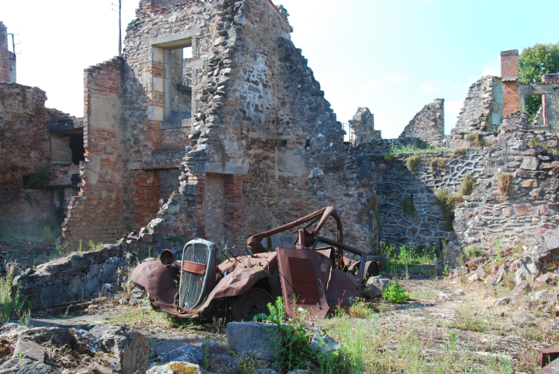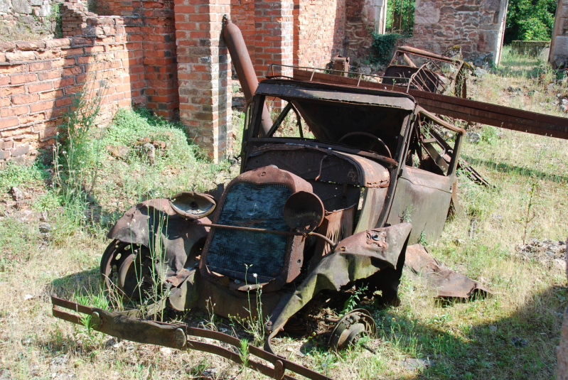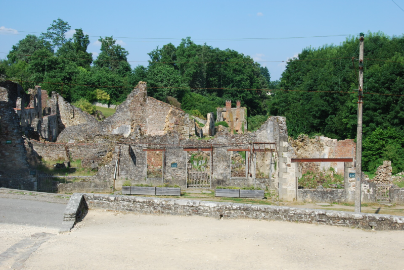 Vandaag willen we naar Oradour sur Glane. We zijn bekend met het verhaal van de massa-executie in juni 1944. Het door de Duitsers verwoeste dorp is daarna nooit meer opgebouwd. De ruïnes dienen als stil protest tegen oorlogsgeweld. De gratis CP is fantastisch; aparte parkeervakken met uitloopruimte. Diverse picknicktafels en keurig aangelegd. We lopen stil door het martelarendorp van 10-6-1944. Verwoeste huizen met vernield huisraad. Inmiddels verroeste auto’s uit de oorlogstijd. In het informatiecentrum wordt het trieste verhaal via beeld en tekst indringend verteld.