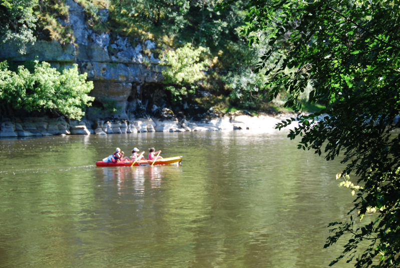 We verplaatsen ons weer een klein stukje en komen zo in Pinsac terecht. Direct achter het kleine gemeentehuis bij een speeltuintje zijn twee plekken gecreëerd. Er loopt een mooi wandelpad naar de oevers van de Dordogne. Eerst lopen we door de gewassen, verderop komen we in de bossen. We vinden een prachtig plekje onder de bomen aan het water. Het is geen straf om hier een tijd door te brengen. Het is druk op de rivier met kano’s. Ook wordt er op diverse plaatsen gezwommen.