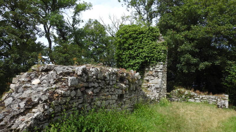 Afgebrokkelde muren, totaal overwoekerd door opdringerig groen, bewijzen ons, dat hier het kasteel heeft gestaan. Verderop staat nog een complete muur van een meter dik en met schietgaten. Aan de zijkant zit een rond gat, wat ongetwijfeld eens de toegangspoort is geweest. We struinen door de brokstukken. Hanna ontdekt, dat ook hier sprake is geweest van een lage en een hoge burcht. Na enig zoeken ontdekken we inderdaad op een hogere rotspartij restanten van ooit eens trotse kantelen. We klauteren er naar toe. Op het hoogste punt wappert trots de vlag. Een aangelegde trap brengt ons naar hetzelfde niveau. We zien de wereld aan onze voeten liggen. De ridders van toen, hadden het slim bekeken. Als je veilig wilt zijn, moet je toezicht hebben op je omgeving. Een wijze les.