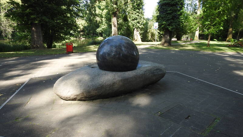 Vlakbij is een mooi park. We kuieren door het groen, omringd met een schitterende bloemenpracht. Er staan allerlei bijzondere voorwerpen in het park. Grote insecten van staal, een bankje in de vorm van een hart, kleine superjachten in de eendenvijver. De smaakmaker had een rollende steen in een bak met water moeten zijn. Maar het kunststuk is kapot. Geen water, dus ook geen rollen.