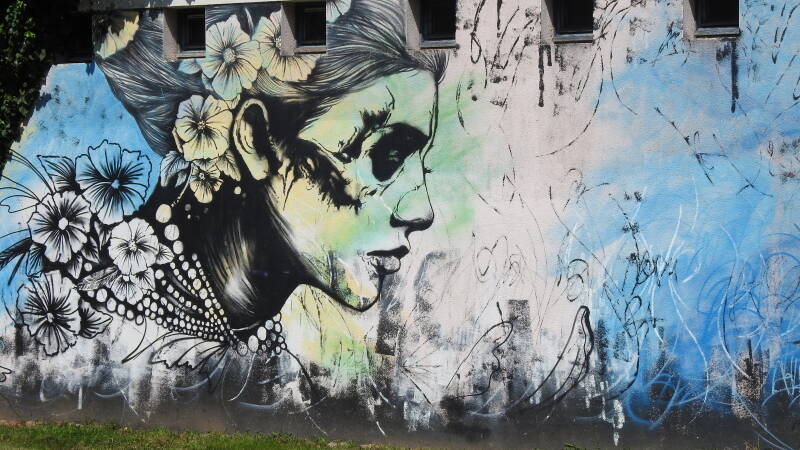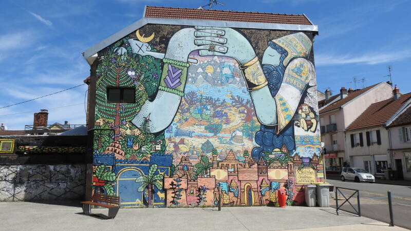 Rondom een plein zijn veel gevels versierd met schilderkunst. Een aantal jaren geleden is hier een festival over street art geweest, en daar zijn de gekleurde huizen nu nog een gevolg van. Er zijn kleine eenvoudige taferelen te zien, maar ook hele grote, die de gehele gevel van een groot pand beslaan. De voorstellingen zijn divers, van vrij kinderlijk aandoende tekeningen, tot schitterende realistische afbeeldingen.